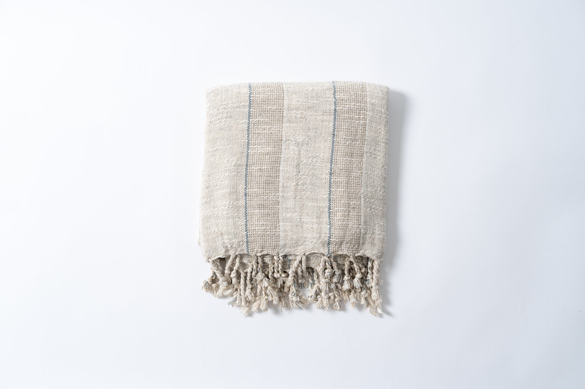 The minimal oat-beige base with delicate blue windowpane stripes brings a calm, Mediterranean look to any space—spa-like in the bathroom, clean and elevated at the beach.